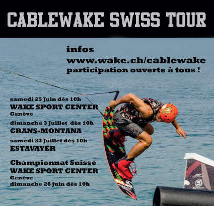 Hinweis für die Cablewake-Fans ! Bitte die 4 Daten der Cablewake Swiss Tour 2016 notieren: Samstag 25. Juni (Etappe Wake Sport Center, Genf), Sonntag 26. Juni (Schweizer-Meisterschaften 2016 Wake Sport Center, Genf), Sonntag 3. Juli (Etappe Crans-Montana), Samstag 23. Juli (Etappe Estavayer-le-Lac). Alle Details und Anmeldungs-Hinweise werden demnächst auf dieser Website, Rubrik "Kalender/Anmeldungen" publiziert.