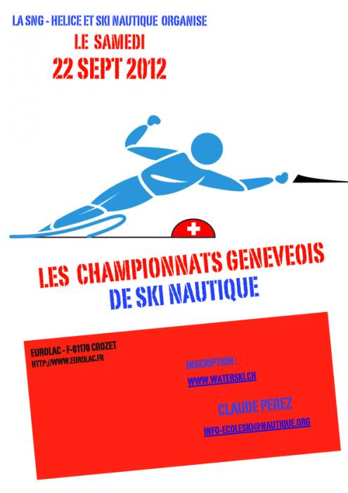 Die Genfer-Meisterschaften Wasserski werden wie immer durch die Société Nautique de Genève organisiert und finden am Samstag, 22. September 2012, mit Start um 7:30 Uhr am Eurolac für die Pro's in den Disziplinen Slalom, Figuren und Springen statt. Der Kids Cup (Les Aiglons) für die unter 13-Jährigen kommt am Sonntag, 23. September 2012 ab 9:30 Uhr am Port Noir zu Austragung.
