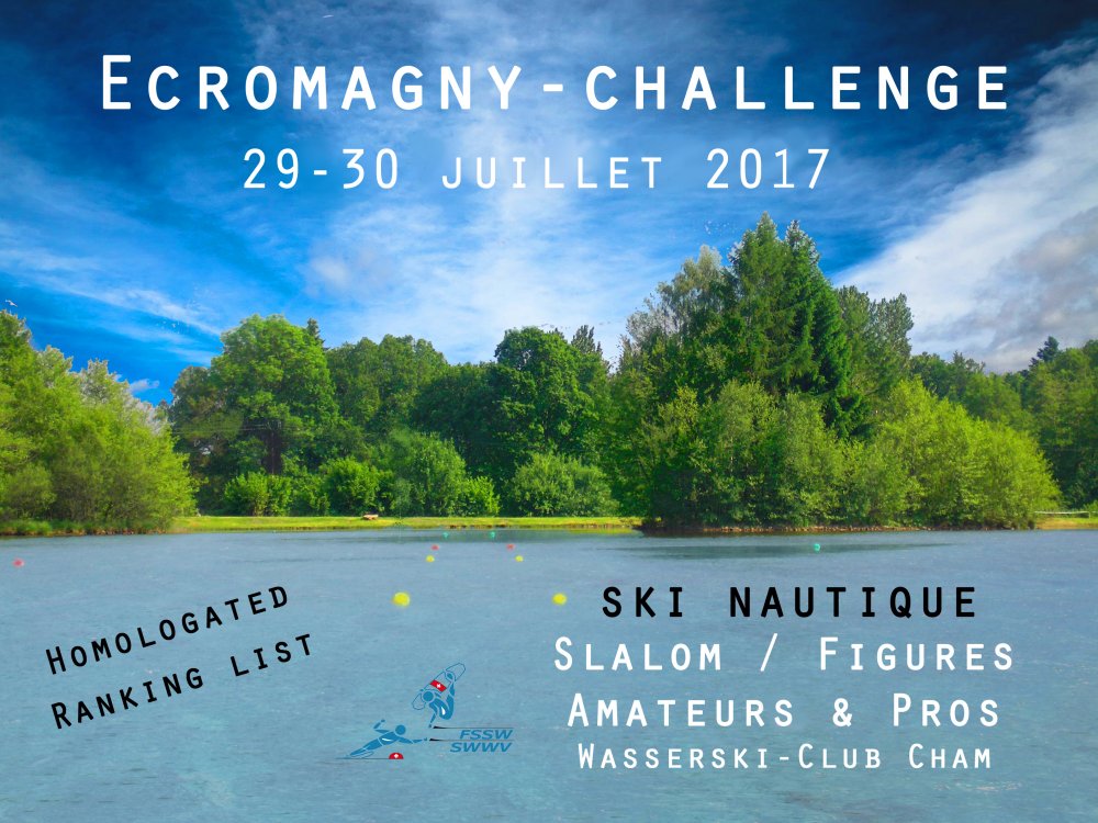 L'EcroChallenge aura lieu les 29 et 30 juillet 2017 à Ecromagny. Cette compétition est ouverte aux licenciés ainsi qu'aux amateurs de la catégorie relax. Homologation "Ranking List International". Au programme : 4 manches slalom et/ou figures. Entraînement le 28 juillet dès 13 h 30. Vous trouverez le bulletin d'information ci-joint. Inscriptions sur ce site dans votre espace personnel (Attention ! Inscriptions limitées à 45 skieurs). Pour toute information complémentaire, merci de contacter Peter Frei (+41 79 414 37 40, ).