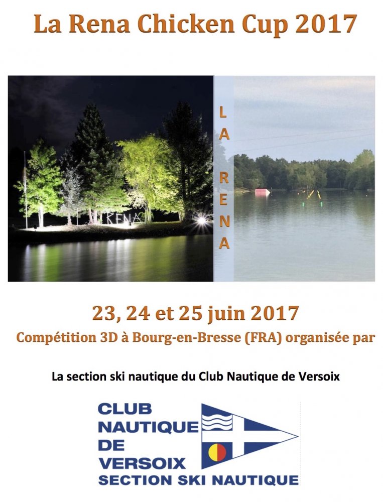 La Section Ski du Club Nautique de Versoix organise une grosse compétition internationale de ski nautique - 3 disciplines, slalom, figures, saut - sur le plan d'eau de LaRena à Bourg-en-Bresse les 23, 24 et 25 juin 2017.