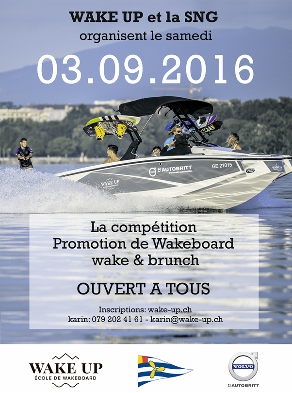 La traditionnelle compétition de PROMOTION wakeboard organisée par la Société Nautique de Genève et le club Wake-Up initialement prévue en juin aura finalement lieu le samedi 3 septembre à partir 8h au Port Noir de Genève. Bateau Moomba Mobius. Cette compétition conviviale est ouverte aux riders de tous niveaux.