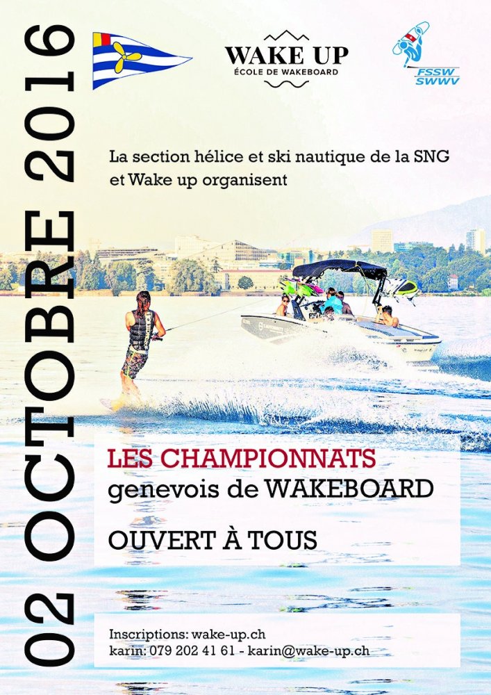 Les championnats genevois 2016 de wakeboard organisés par la SNG et le club Wake-Up auront lieu dimanche 2 octobre sur le plan d'eau du Port-Noir à Genève. Cette compétition est ouverte à tous les riders, qu'ils soient expérimentés ou débutants. Bateau Heyday WT1.