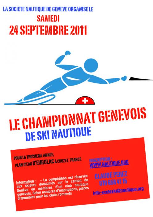 Le championnat genevois de ski nautique organisé par la Société Nautique de Genève se déroulera le 24 septembre à Eurolac (F), à 5 mn de la frontière. La compétition est réservée en priorité aux skieurs domiciliés dans le canton de Genève ou membres d'un club nautique genevois. Néanmoins, elle sera ouverte à d'autres clubs en fonction des places disponibles. Au programme : slalom, figures et saut ainsi que des épreuves pour les aiglons du lac. Voir le programme avec plan d'accès à Eurolac et le formulaire d'inscription ci-dessous. Inscriptions à envoyer à Claude Perez () le 21 septembre au plus tard.